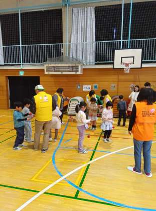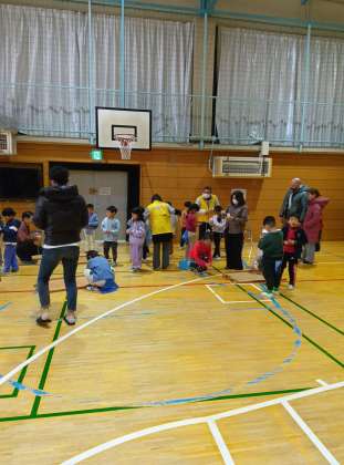 体育館で、地域の皆様にご協力いただき、昔あそびを楽しみました。学校公開日なので保護者の皆様も一緒に楽しんでいました。