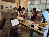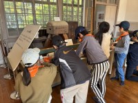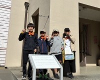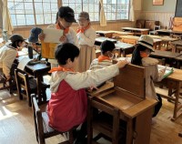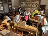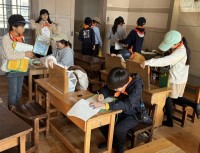 昔の小学校(旧府中尋常高等小学校)です。この校舎は、市立府中第一小学校の前身である府中町立府中尋常高等小学校として1935年(昭和10)9月に建設されました。以後1979年(昭和54)の新校舎建築に伴って取り壊されるまで、多くの子どもたちの学び舎として親しまれてきました。教室や講堂にも入って来ました。