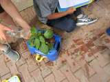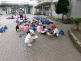 5種類の野菜の苗を植えた2年生が、その後の様子をスケッチしたり、水やりをしたりしています。運動会練習合い間の生活科学習です。