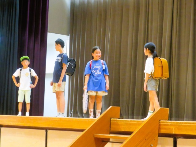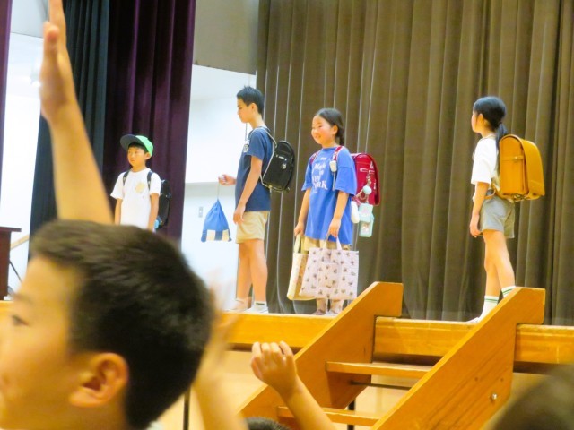 登下校シーンでのクイズは、帽子の種類と手さげを両手に持っているところが正解です!