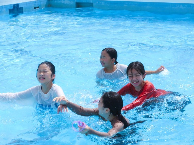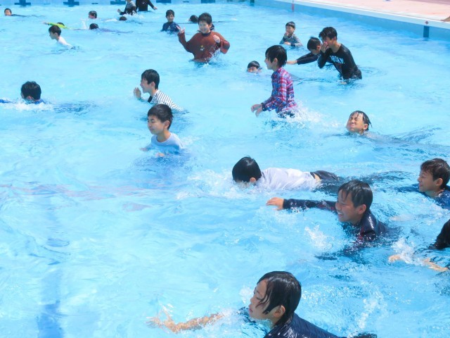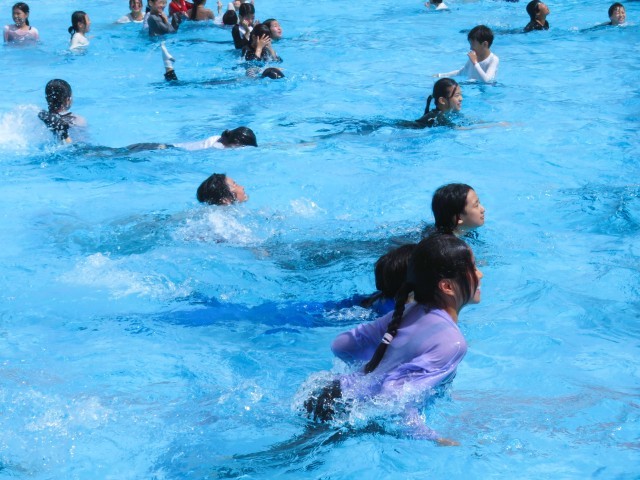 今日は5年生の水泳授業で「命を守る泳ぎ」着衣泳の学習を行いました。川や海、プールなどで溺れてしまった場合、助かる可能性をより高くするためにはどのようにすることが最善か、考えながら学びました。子どもたちは着衣をしたまま、歩いたり走ったりして、着衣状態では重くて困難なことを体験しました。