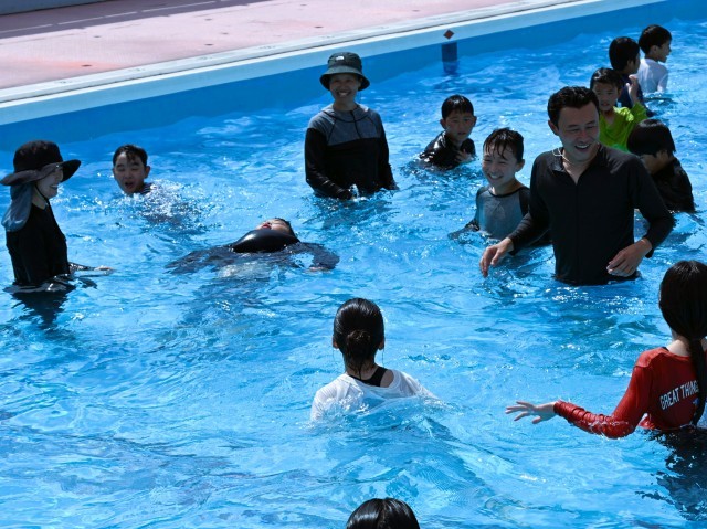 シャツとお腹の間に空気をためると浮力が得られることを、先生や友達のお手本から勉強しました!