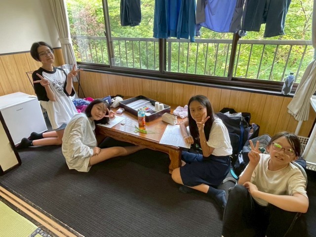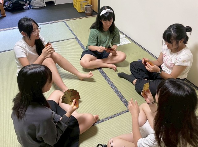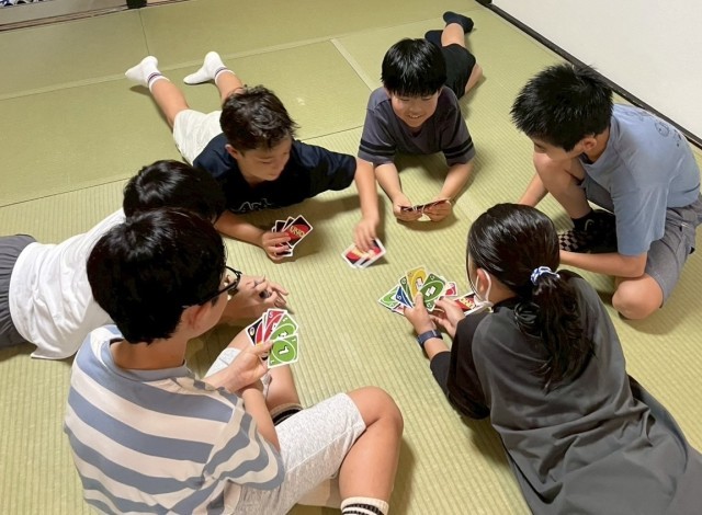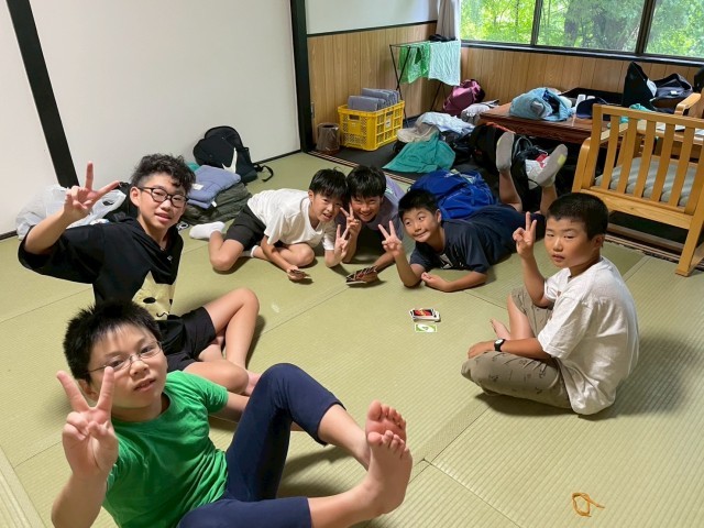 開園式後は、ホテル内でくつろいでいます。カードゲームをして過ごしている部屋が多くあります。