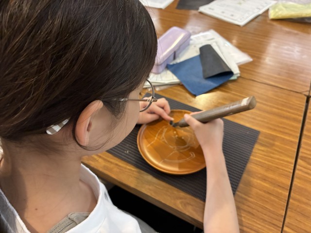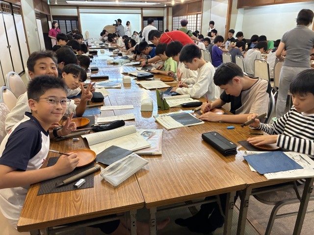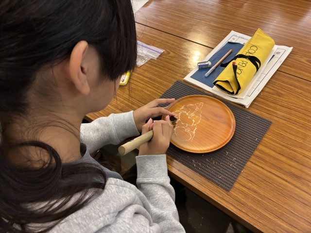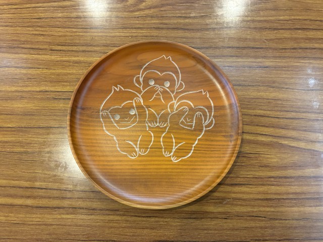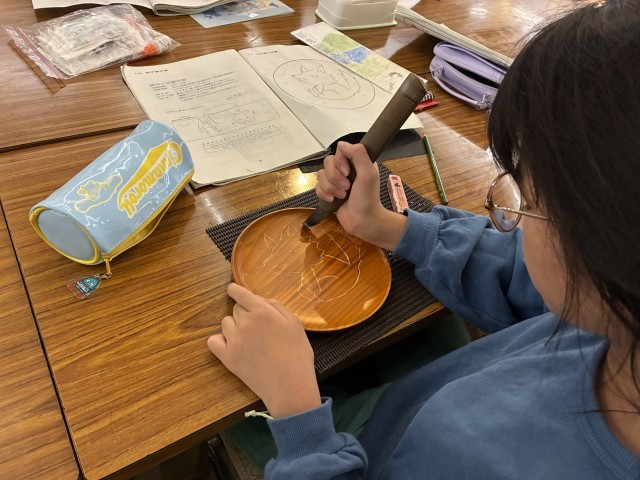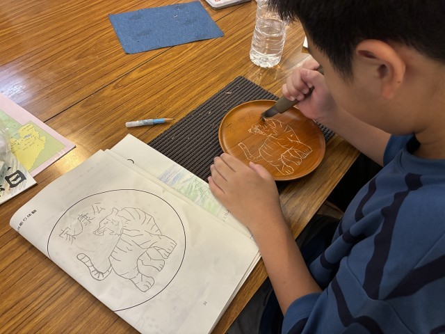 青晃苑では日光彫り体験をしました。使う道具は、「日光ひっかき刀」です。図工の版画で使った彫刻刀とは違い、先端がおよそ60度位に折れ曲がっています。手前に引いて彫っていきます。最初は慣れない手つきでしたが、だんだんとコツをつかみ、一人ひとりが世界で一つだけの作品を仕上げました。持ち帰りをお楽しみに。日光彫りを教えてくださった先生が、松丘小のために三猿を彫ってくださいました。
