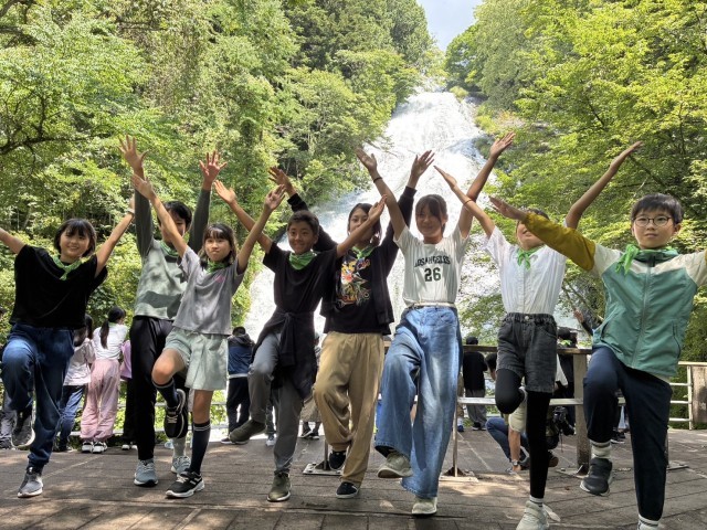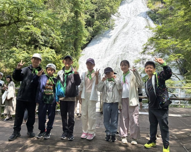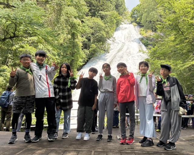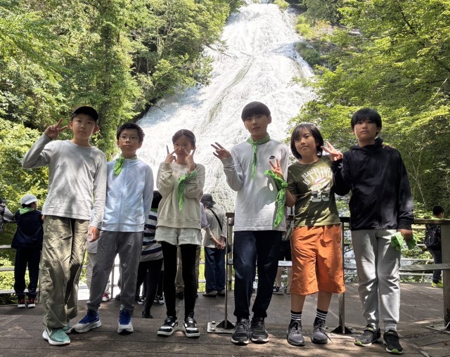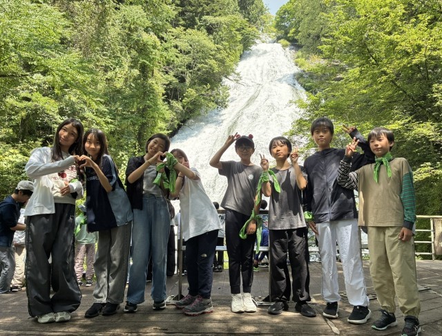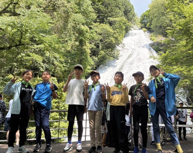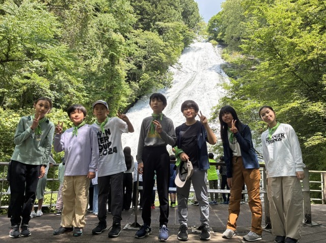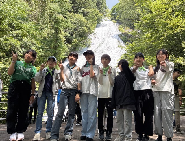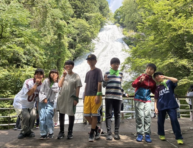 湯滝に到着しました。湯ノ湖から流れ落ちる落差50mの豪快な滝です。グループごとに写真を撮りました。清涼感をみんなで満喫しました!