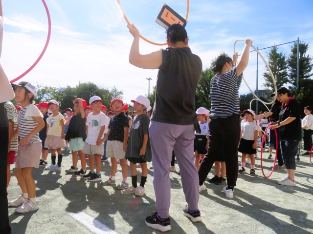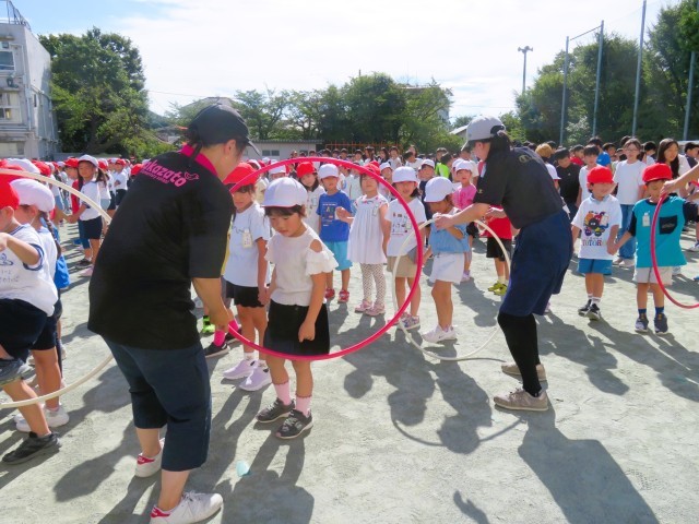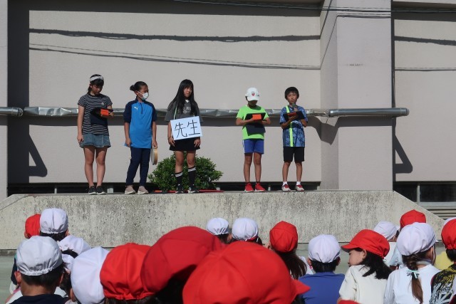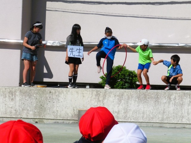 今日の児童集会は、集会委員会による「フラフープリレー」です。まずは、ルール説明を行いゲームの開始です。クラス対抗戦で行いました。