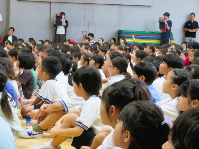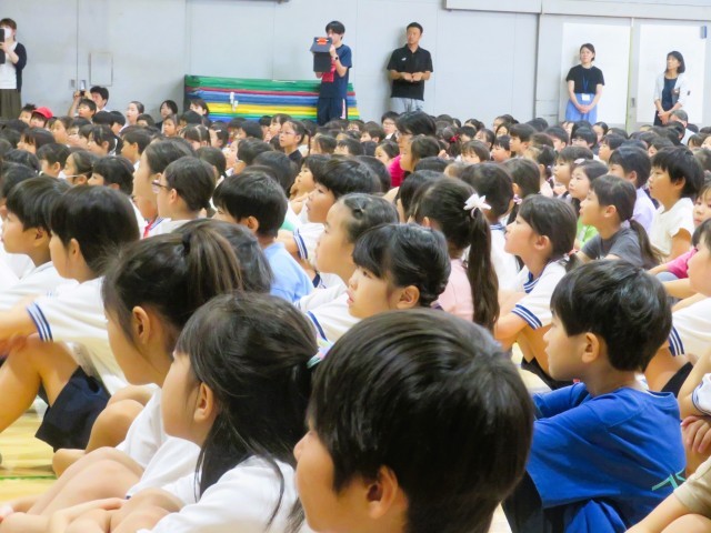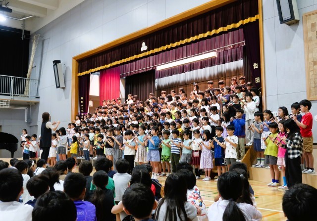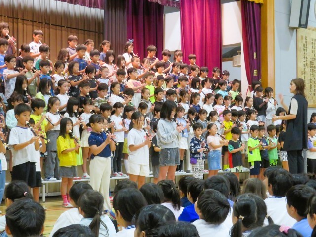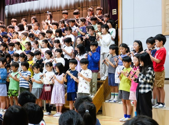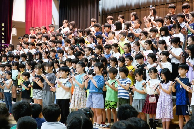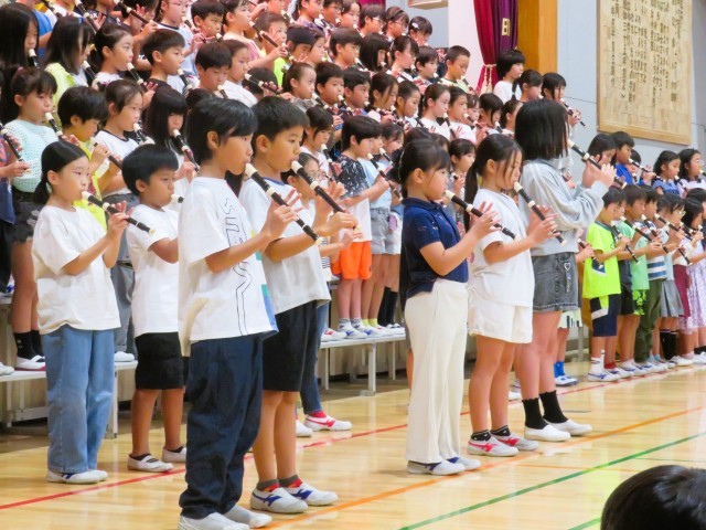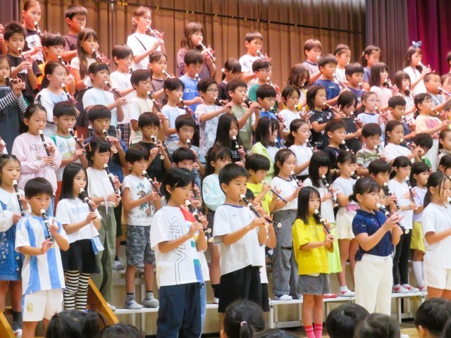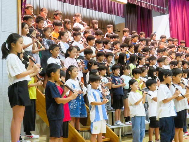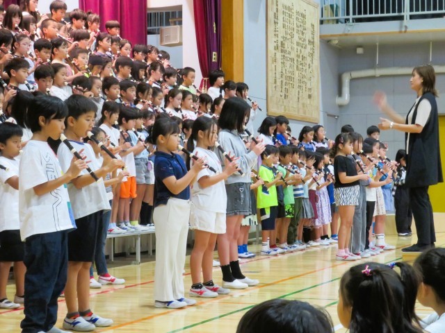 2曲目は、リコーダー「ソラシドマーチ」です。この曲は、ソ、ラ、シ、ドの4つの音だけを使って作られた明るい曲です。習いたてのリコーダーですが、たくさん練習して少しずつ吹けるようになりました。3年生の本気の発表は、聴いている子どもたち、先生方、保護者の方々から体育館いっぱいに響き渡る大きな拍手をいただきました。3年生、よくがんばりましたね!