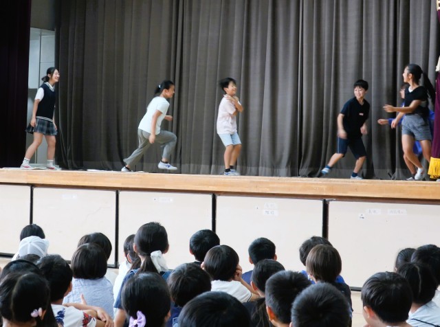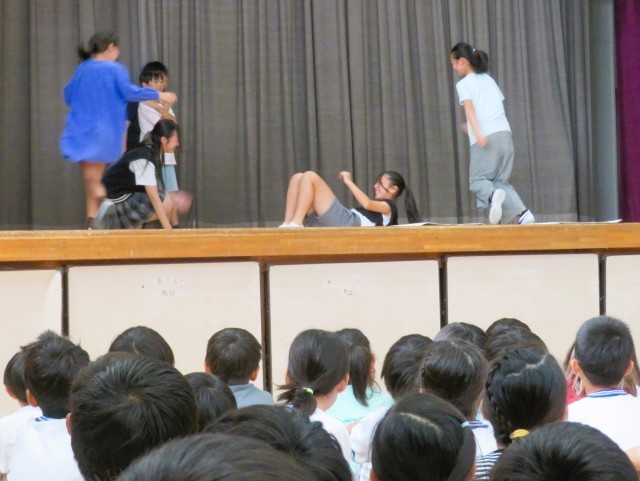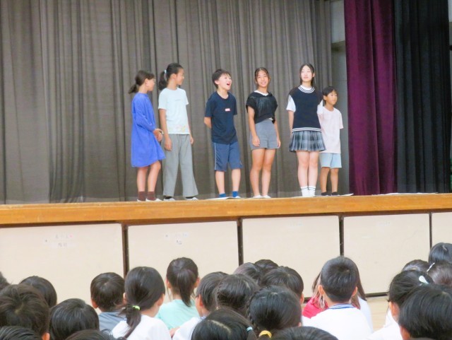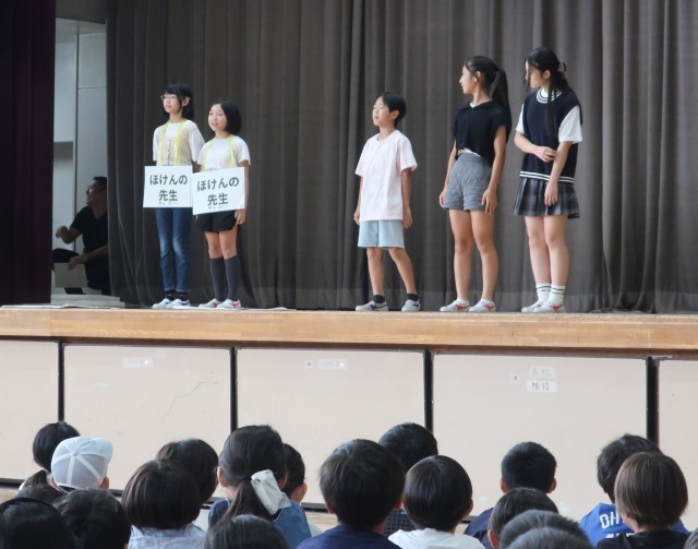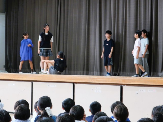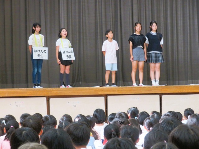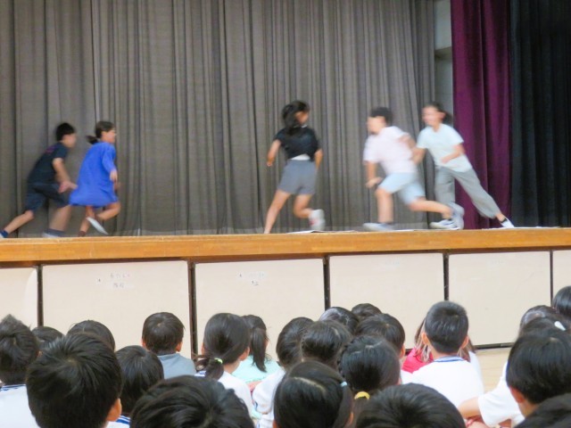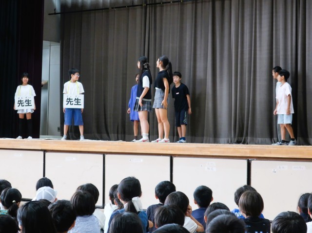 今日の児童集会は企画・代表委員会の発表です。安心安全な学校生活に向けて、寸劇やクイズを出題しながら、わかりやすく発表しました。
