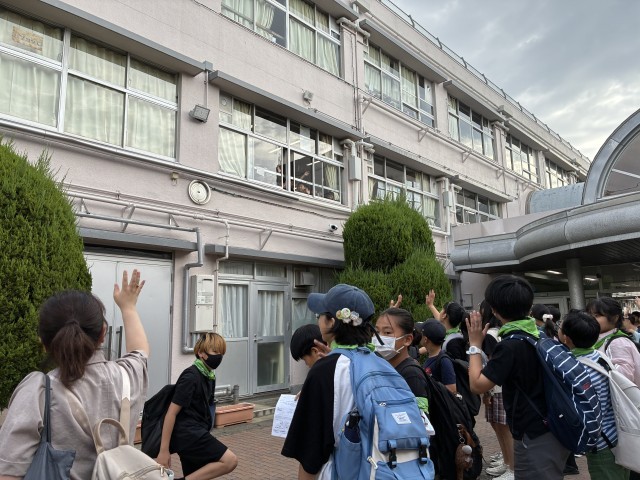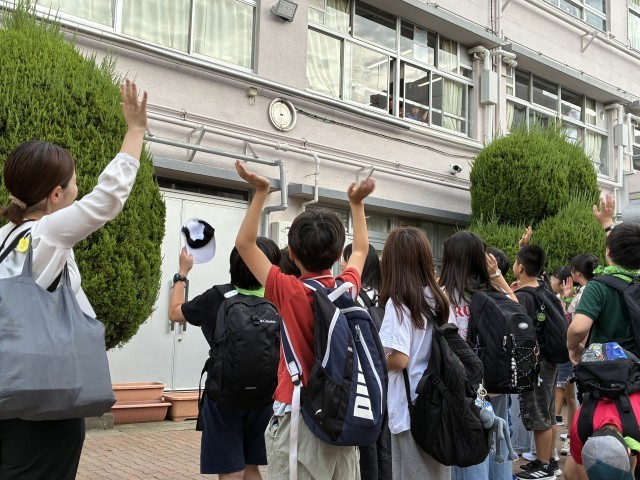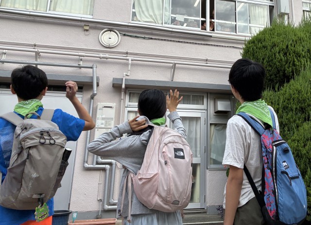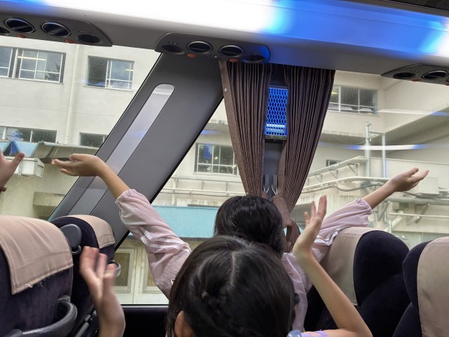 6年生が出発するときに、2年生が「いってらっしゃーい!」と、温かく手を振って見送ってくれました。4年生は掲示物と校舎の廊下側の窓からバスに向かって見送ってくれました!