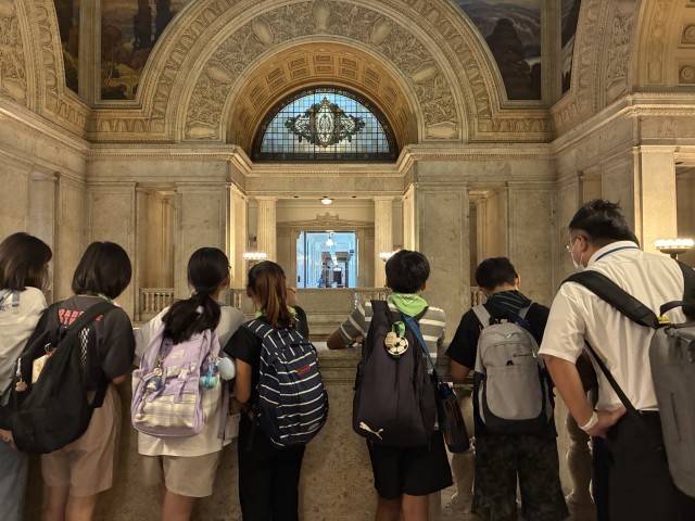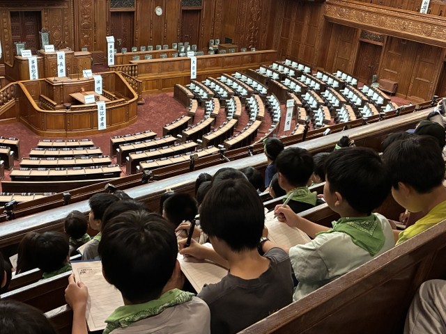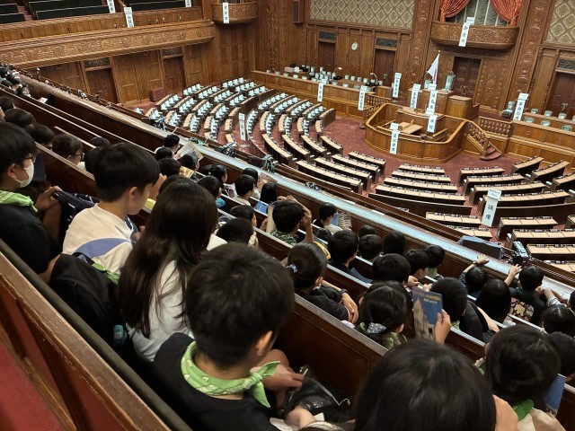 最初の見学地、国会議事堂に到着しました。建物内は、ふかふかの赤じゅうたんが敷き詰められていました。衆議院本会議場に入り、座って説明を聞くことができました。幸運な子どもたちです!