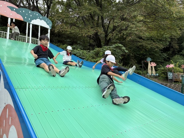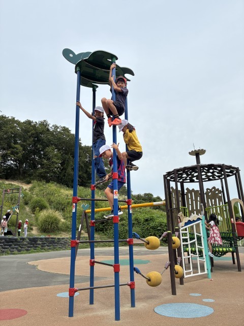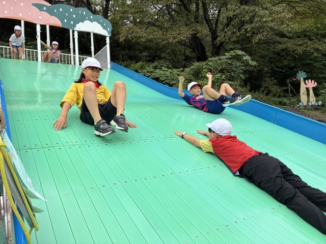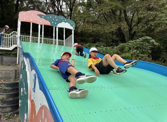 遊具広場「タイムトラベル」で遊ぼうというミッションです。プテラノドンのすべり台です。遊び方が他の学校とは違い豪快です!