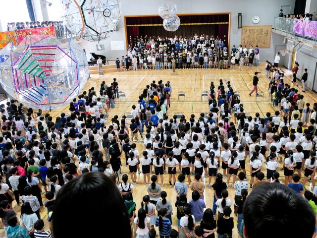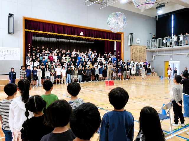 70周年記念式典は、来賓の方々を囲むようにして、全校児童の歌声で盛り上げます。