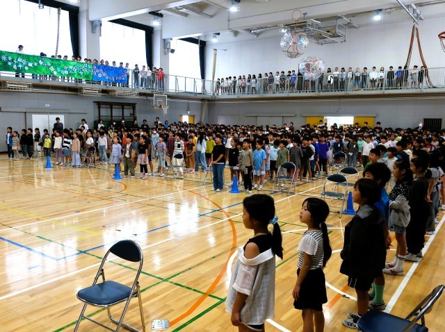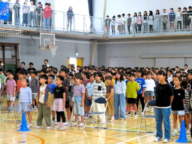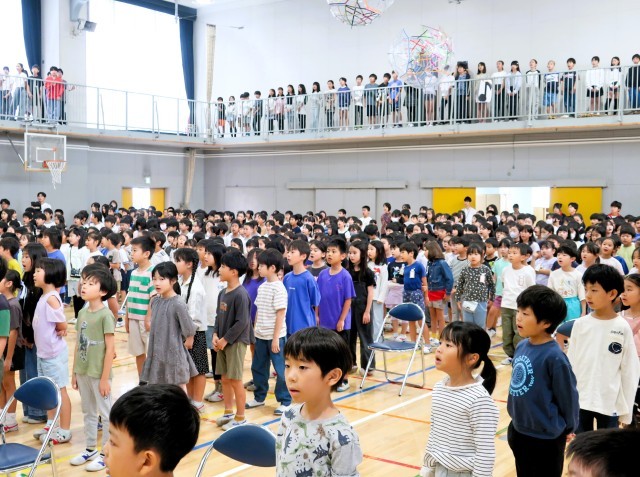 6年生はステージから、5年生は体育館ギャラリーから、1~4年生はフロアから、いい声といい姿勢で70周年のお祝いをします。