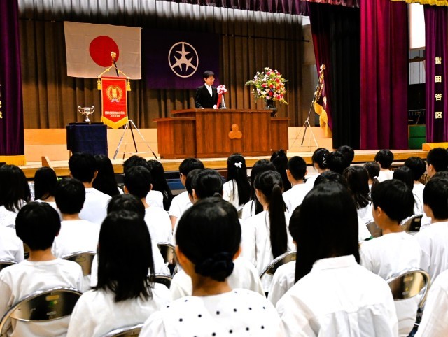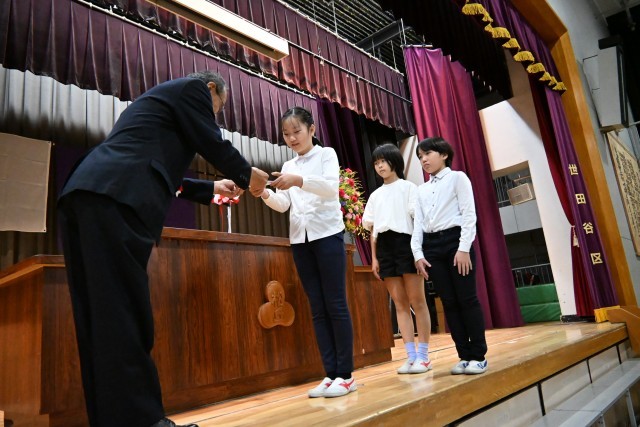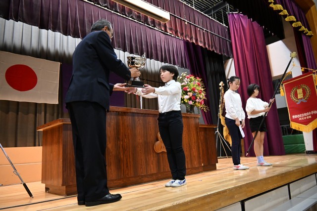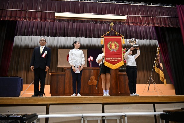 今日は、開校70周年記念式典が行われ、子どもたちの歌声に包まれた、松丘小学校らしい温かく素敵な式典になりました。記念品として同窓会から、運動会で使用する新しい優勝旗と準優勝カップをいただきました。