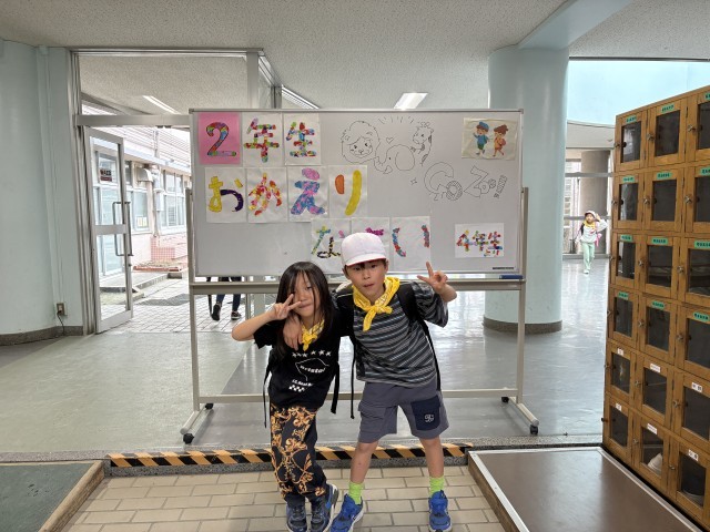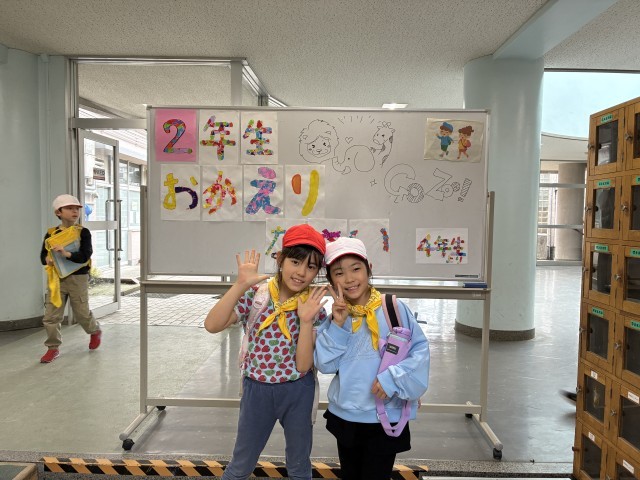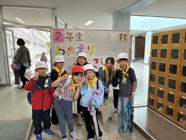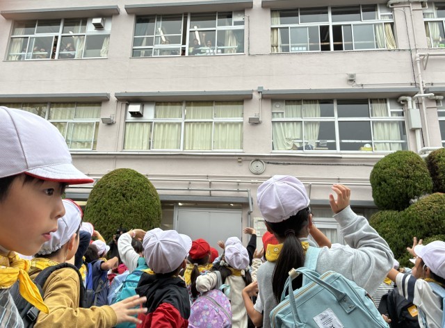 帰ってきた2年生を6年生や4年生の上級生が「おかえりなさい!」とお迎えしています!