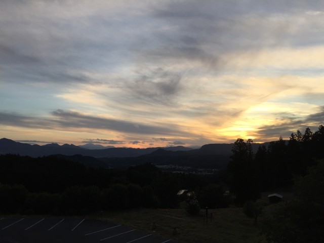 17時45分、宿舎から見える、遠くの山々に夕日が沈んでいく様子です。15分後には、もう真っ暗闇になりました。