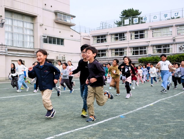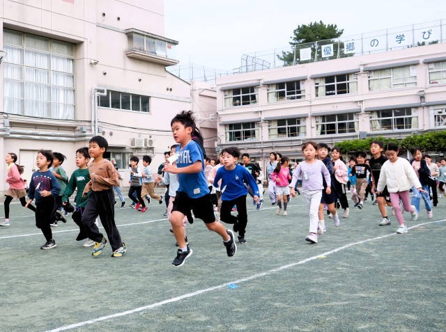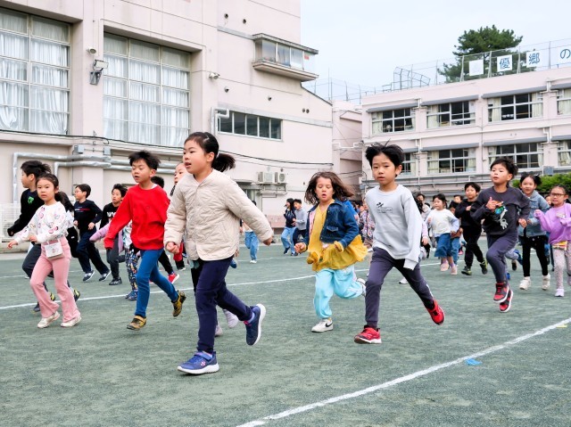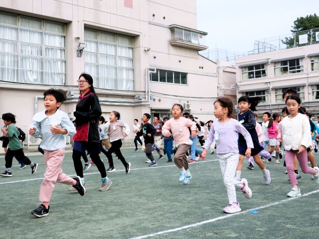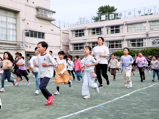 写真は1年生のランニングです。一緒に走る先生や友達に励まされながら、元気に走り切りました。