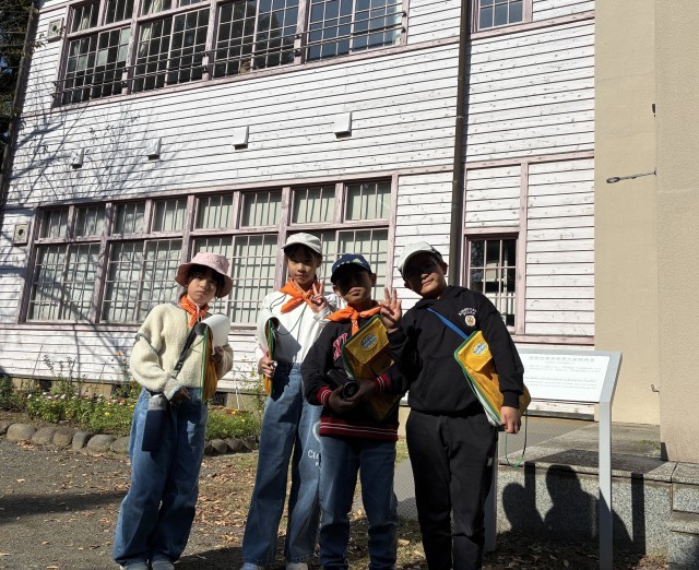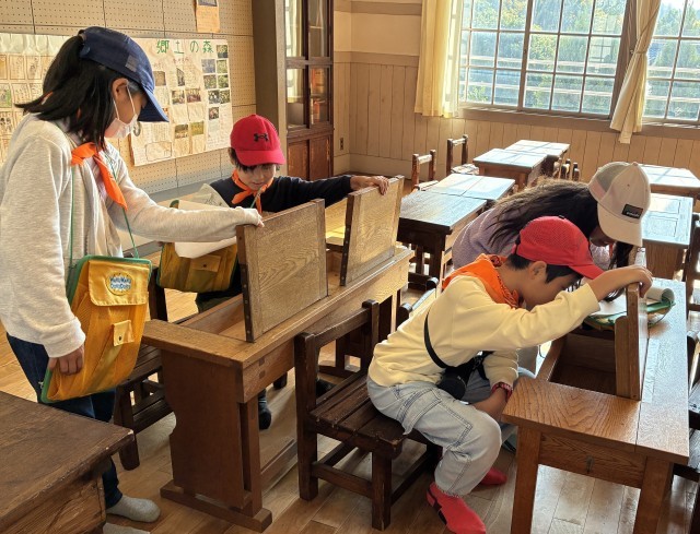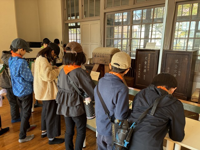 昔の小学校(旧府中尋常高等小学校)です。この校舎は、市立府中第一小学校の前身である府中町立府中尋常高等小学校として1935年(昭和10)9月に建設されました。以後1979年(昭和54)の新校舎建築に伴って取り壊されるまで、多くの子どもたちの学び舎として親しまれてきました。教室や講堂にも入って来ました。