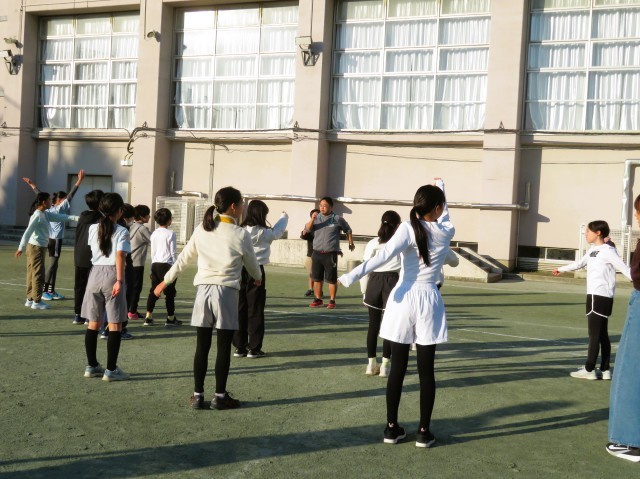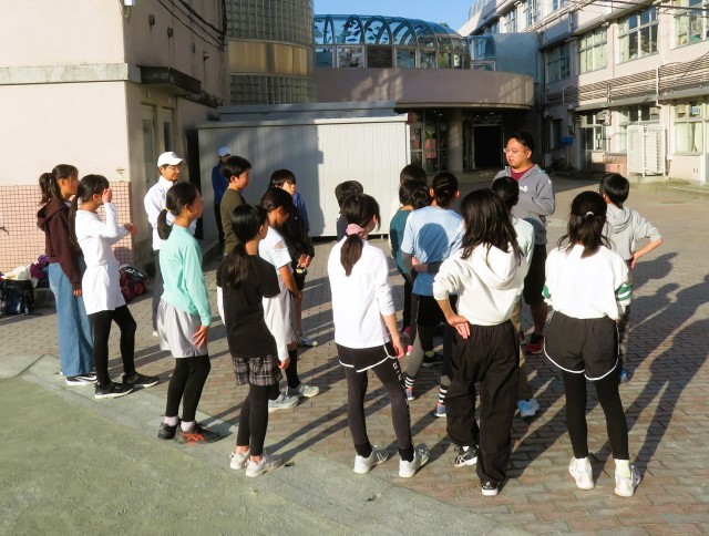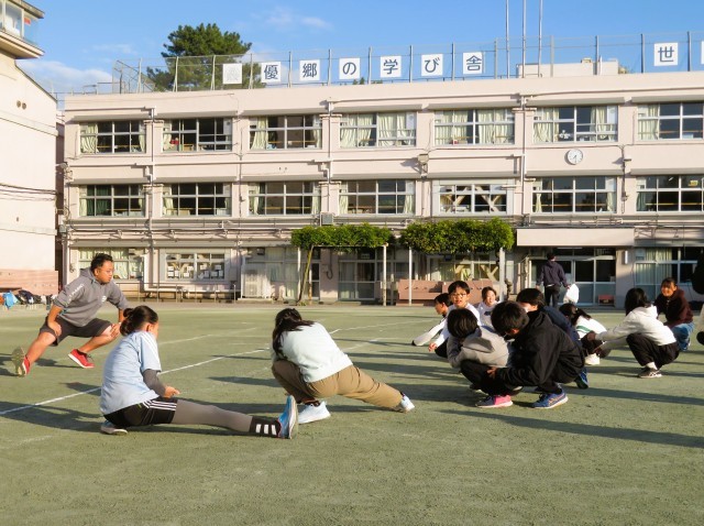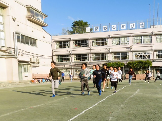 今朝は、世田谷子ども駅伝に向けて、松丘小学校単独での朝練習です。武井監督と準備運動をして、心と体を温めほぐしています。今日のメイン練習は、200mのインターバル走で、スピードと持久力を磨きました。