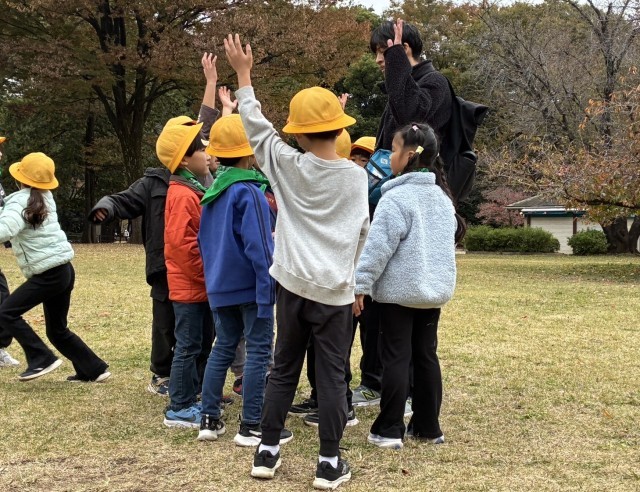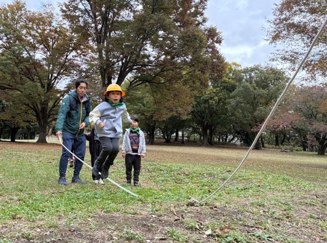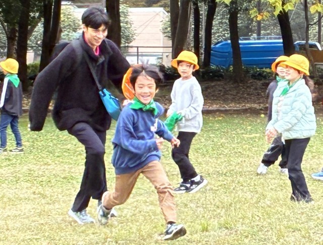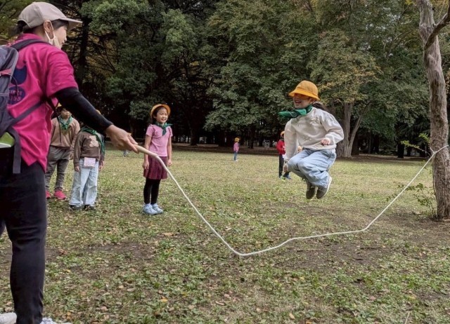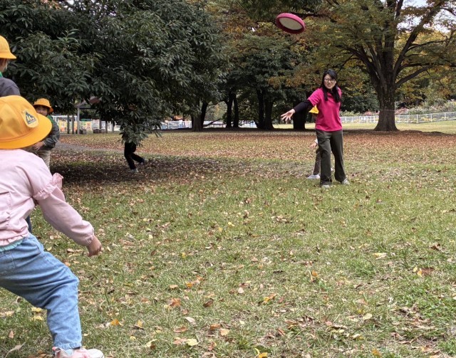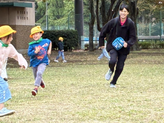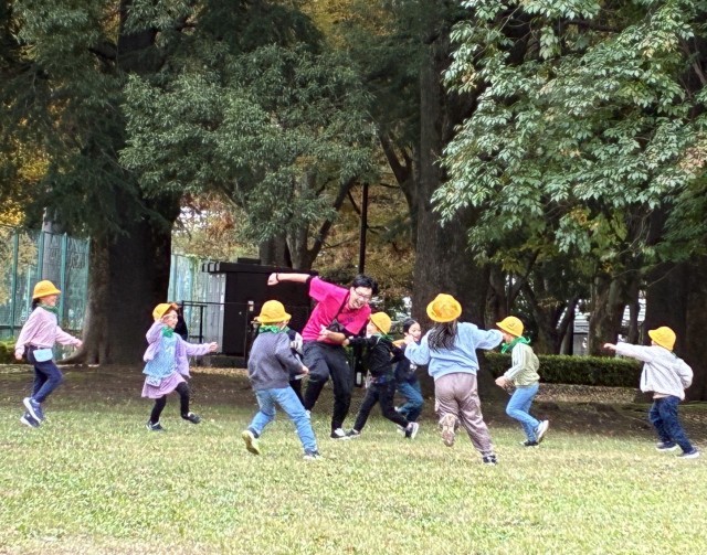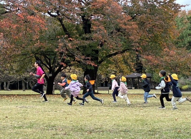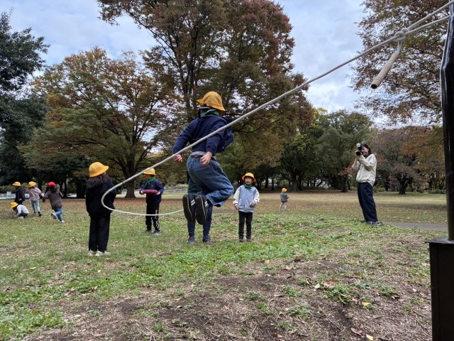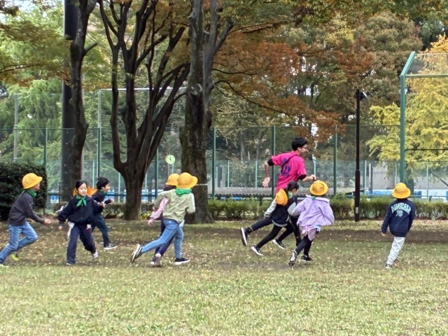 砧公園で元気いっぱいに遊びました。「鬼ごっこ」「ドッジビー」「長縄跳び」で遊んでいる子が多くいました!