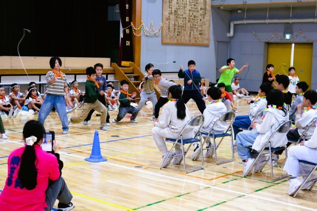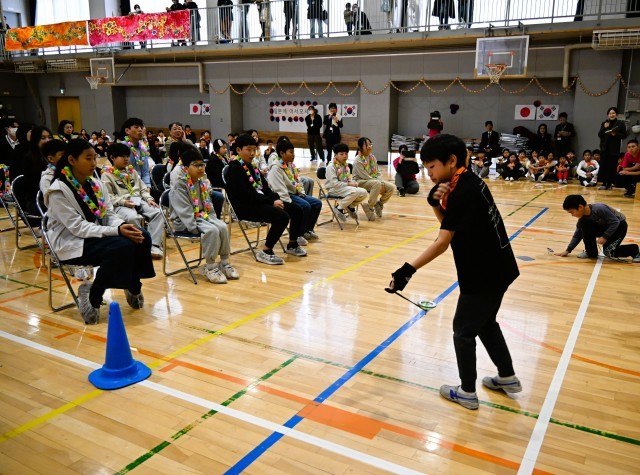 私のあいさつ、続いて日本の昔遊びを披露しました。こま回しの様子ですが「こまの達人」もいてびっくりです!