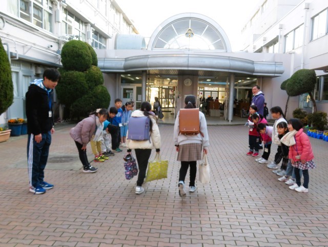 今日は1月の「優郷の学び舎」あいさつ運動1日目です。2年生が正門と南門でのあいさつ運動です。登校して来る子どもたちへ、気持ちのよいあいさつを投げ掛けてくれています。