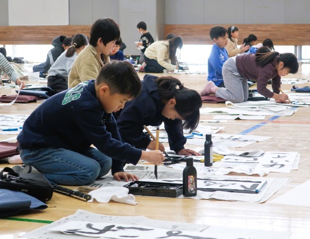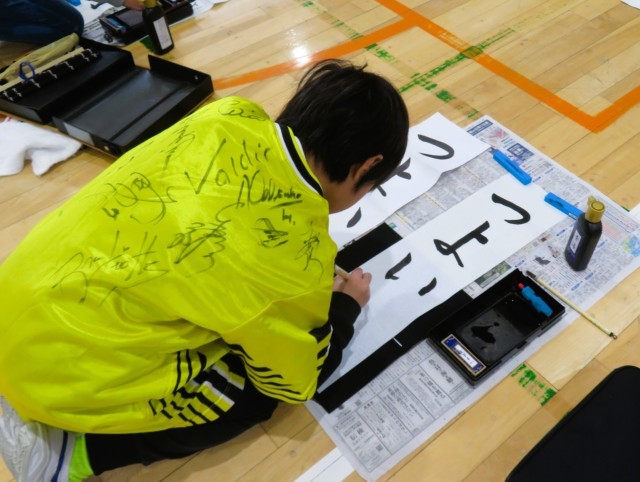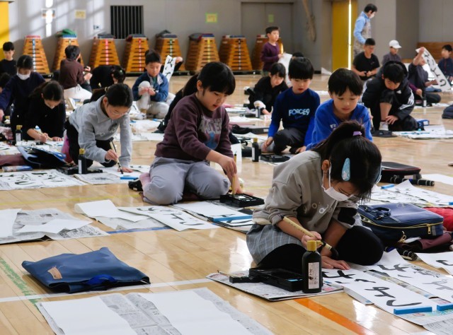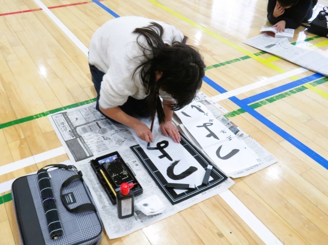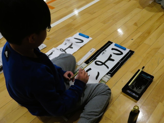 3年生席書会の様子です。3年生からはじめた毛筆で初めての席書会です。心を落ち着け、ていねいに筆を進めていました。真剣な眼差しに、緊張感が伝わってきました。「つよい力」という字のバランスを考えて、真剣に書いています。