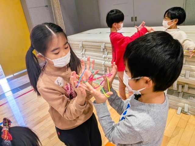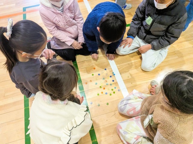 1・2年生の「昔遊び交流会」の様子です。8つの遊びに分かれ、2年生が1年生に昔遊びの技を教えました。
