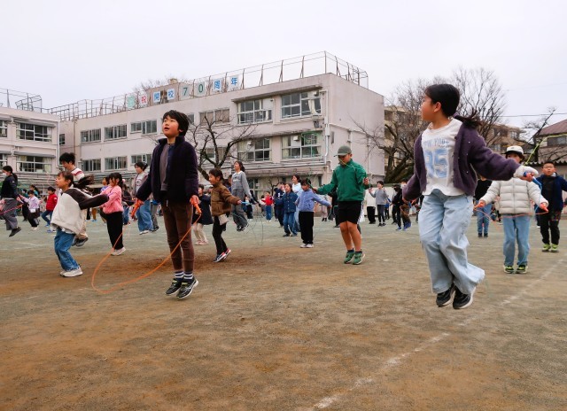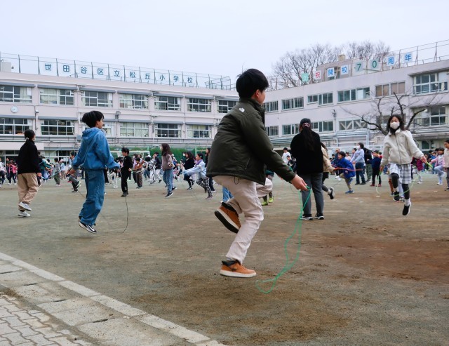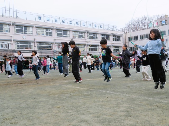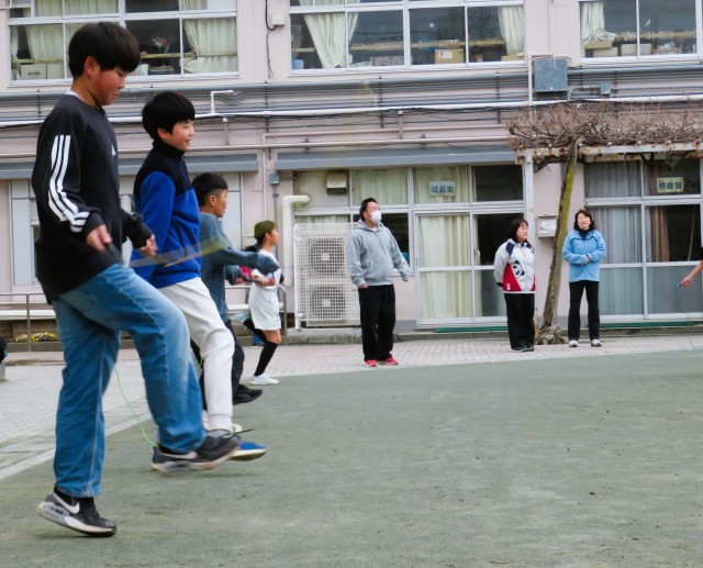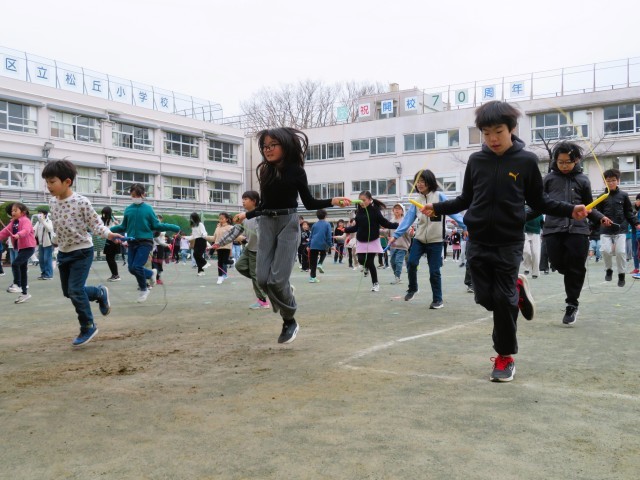 後半は、体育委員会の子を手本に「リズム縄跳び」に取り組みました。基本的な前とび、後ろとび、前振りとびなど、様々な跳び方を織り交ぜています。これからも体育授業、休み時間などで取り組んでいきます。