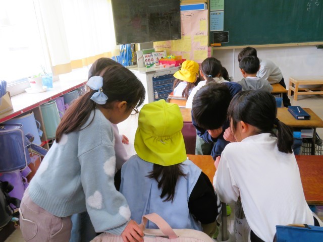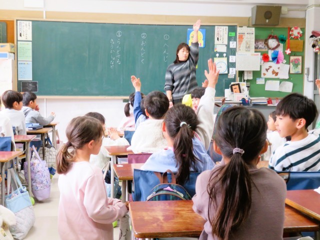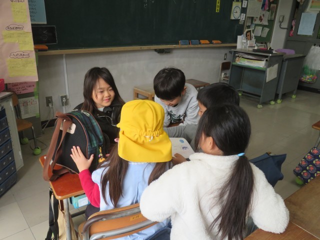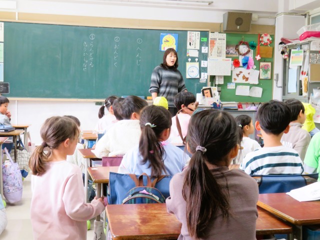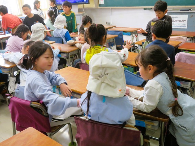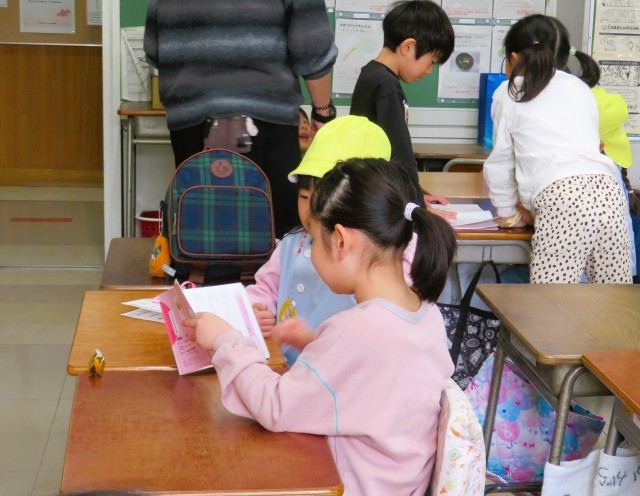 今日は、本校の1年生と松丘幼稚園、弦巻保育園、西弦巻保育園、東弦巻保育園の年長さんとの交流会がありました。小学校の生活を知ってもらおうということで、体育館交流、授業体験、学校探検を行いました。授業体験では、あいさつとお返事、おんどくの勉強です。