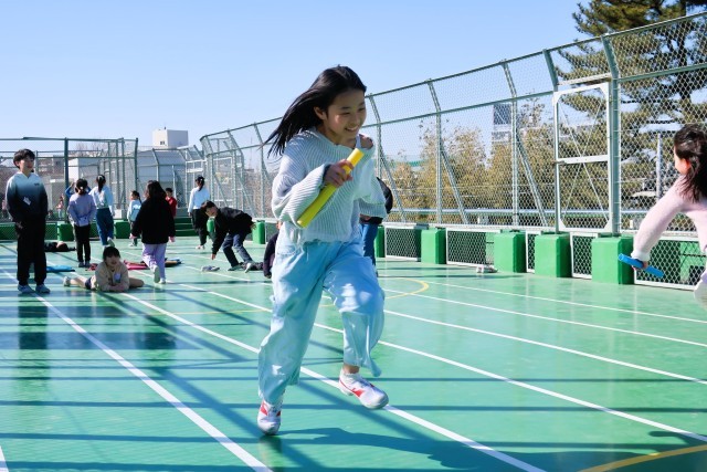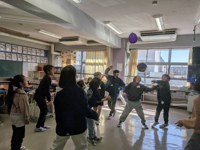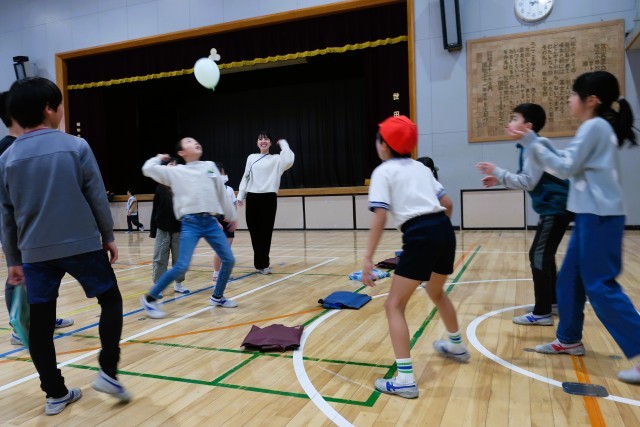 リレー、長縄跳び、風船バレーで遊んでいる班の様子です。