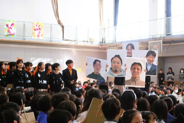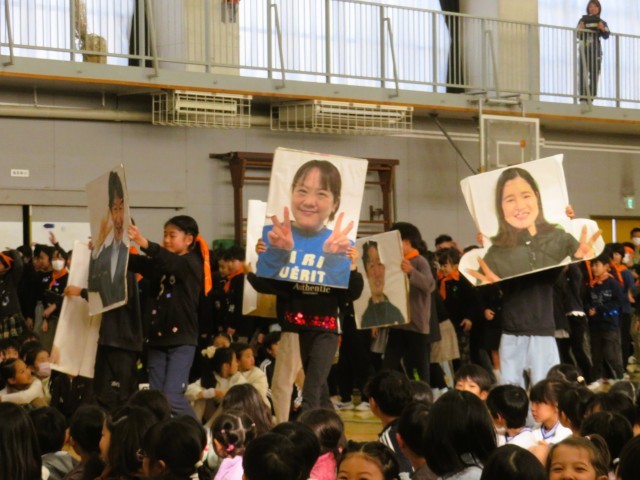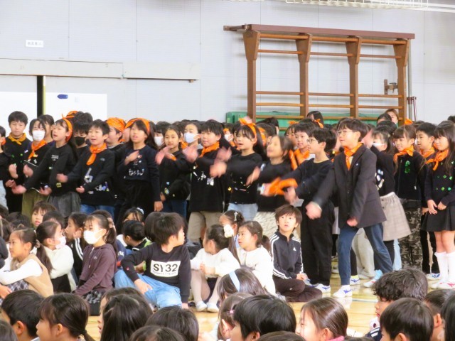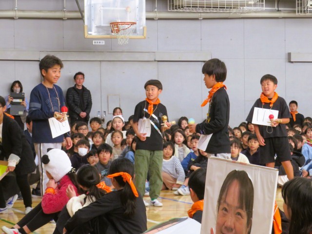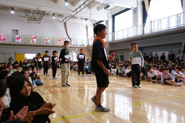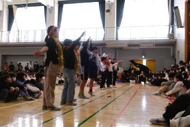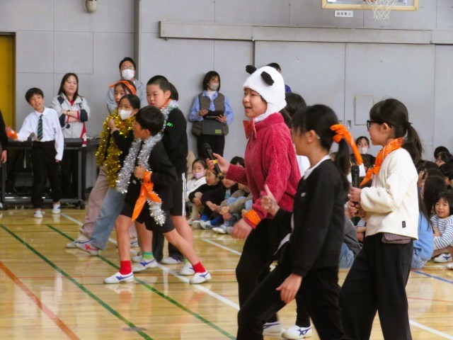 トップバッターは4年生です。4年生は「松丘紅白」を開催しました。けん玉で松丘ギネスにも挑戦です!M!LKの「イイじゃん」に合わせて歌とダンスを披露し、6年生の“イイじゃん!”と思うところを歌詞にのせて紹介しました。