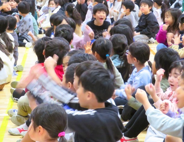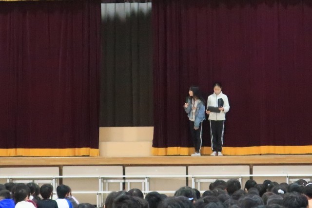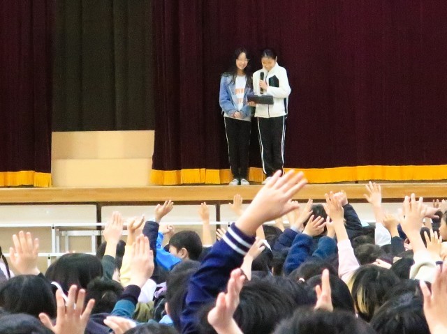 集会委員会のゲーム集会で、「何が通ったでしょうクイズ」を行いました。。ステージの幕と幕の間から「チラッ!」と、通った物を当てるというゲームです。第1問「今、投げたのはバスケットボールである。〇か✖か」速すぎて写真ではとらえられませんでした。正解の紹介です。