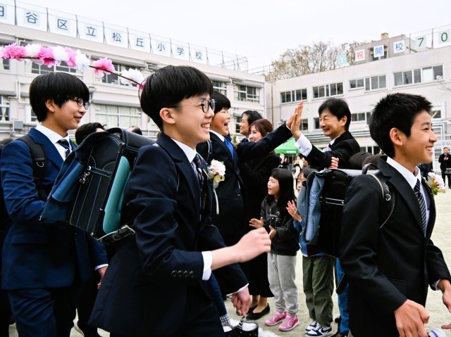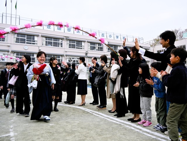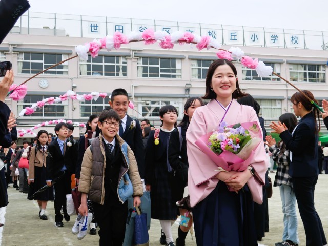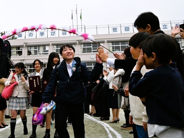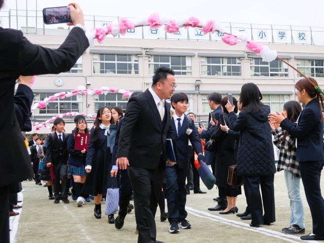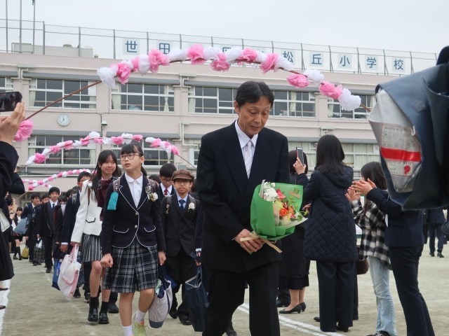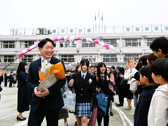 校庭に花道を作り、温かい拍手で卒業生の門出を祝いました。