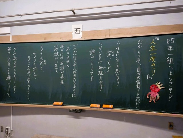 これから登校してくる子どもたちへ向けた、先生たちへのメッセージが黒板に書かれていました。