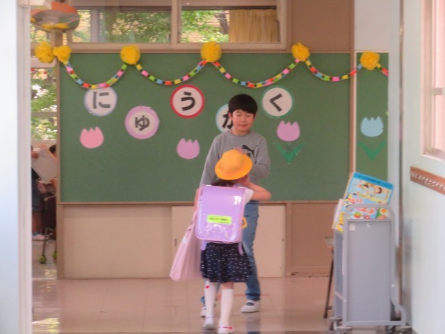 1年生と一緒に、優しく声を掛けながらお手伝いをしています。