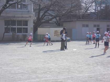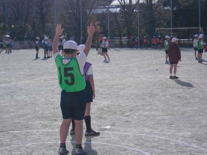 校庭では、寒さに負けず、4年生がバスケット型のボールゲームをしています。工夫したポートボールです。ルールを考えたり、作戦を立てたり・・・・ボールを扱うチームでのゲームは、なかなか白熱しています。