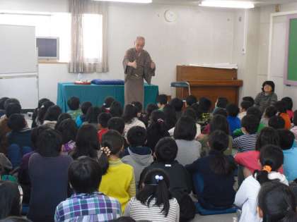 4年生の国語の授業では、「落語」を勉強します。今日は、三遊亭圓窓師匠をゲストティーチャーにお招きし授業をお願いしました。