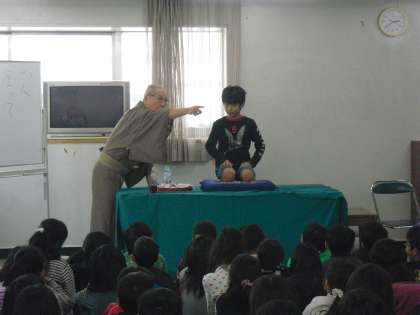 はじめに落語の基本的なお話をうかがい、そのあと、師匠に落語を演じていただきました。そして、子どもたちがいよいよ、好きなところ、自分ができそうなところを演じます。子どもたちは積極的に手を挙げチャレンジしていました。師匠からじきじきに手ほどきを受け、満足そうでした。