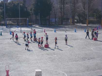 大雪の影響で校庭がなかなか使えませんでした。教職員と主事で校庭の雪を取り除き、ようやく土が見え、使えるようになってきました。しかし、霜がおりるので、昼になると校庭はぬかるんできます。