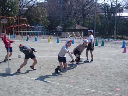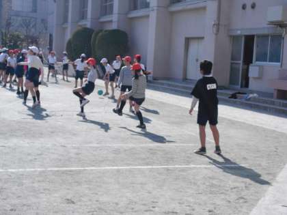 校庭では、子どもたちが元気に体育の授業に取り組んでいます。体つくりを研究の重点にして取り組んでいる松丘小学校です。授業の中で体験したことが、日常の遊びの中に広がっていくことを期待しています。