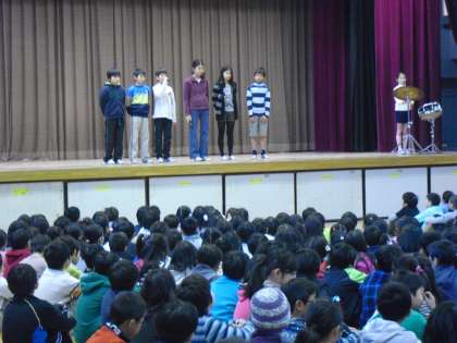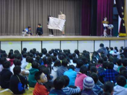 演技上手な集会委員に全校の子どもたちは引き込まれていました。色々な形に変化し文字を読み、パズルを完成させていきました。短い時間でしたが、子どもたちが一体となっている楽しい集会でした。