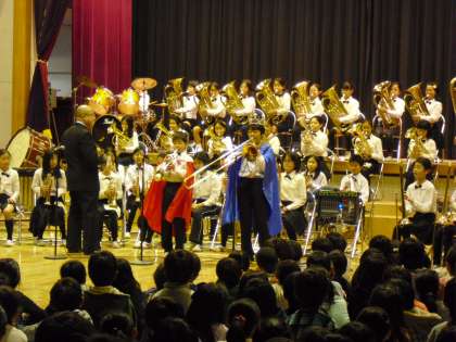 2月16日に世田谷区民会館で、管楽器発表会が開催されます。今日は、そのリハーサルで、全校児童に発表しました。