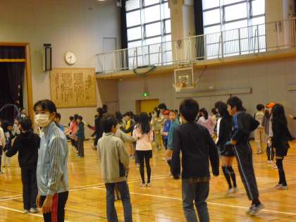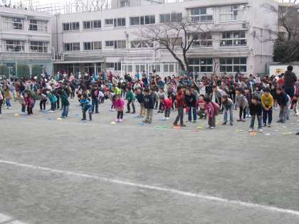 雪のちらつく寒い中でしたが、体育朝会をすることができました。子どもたちには家でもちょっとの時間に縄跳びに取り組んでほしいと願っています。