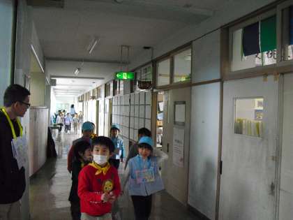 小学校の教室にあと2カ月で入る年長の子どもたち。あまり、緊張した様子はなく、案内する1年生のほうが緊張気味?