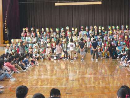 1年生は冠をかぶり、ペンダントをつけています。冠は4年生、ペンダントは3年生が作成したものです。