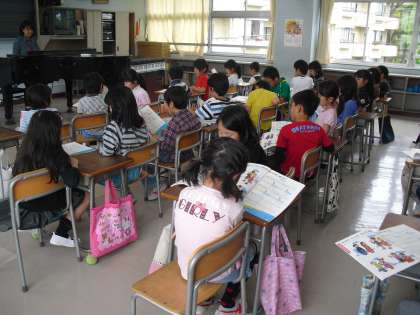 2年生は、専科の先生の音楽授業です。「世界の言葉であいさつをする。」というとての楽しい授業でした。歌う子どもとあいさつする子どもと分かれてやりとりしたり、全員で歌ったり・・・・あいさつの言葉を勉強した子どもたち。校内で、元気よく色々と出会う人にあいさつすることを呼び掛けていきたいです。