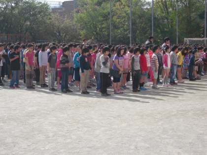 そのあと、高学年から順番に全校に見てもらいましたが、なかなか立派にできました。キビキビ動き、気持ちの良い動作でした。これからの集団行動でもっともっと練習し、運動会ではかっこいい姿を見せることができるのではないでしょうか。