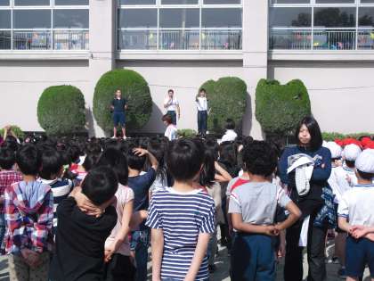 初夏の気配を感じる朝、体育朝会では集団行動の練習をしました。気をつけ、前へならえ、そして行進・・・・・・などなどよい例と悪い例をみながら勉強していきました。