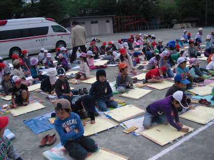 1年生2年生が校庭で、消防車と救急車の写生をしました。世田谷消防署から1台ずつ車を出していただき、間近で消防車と救急車を見て写生しています。